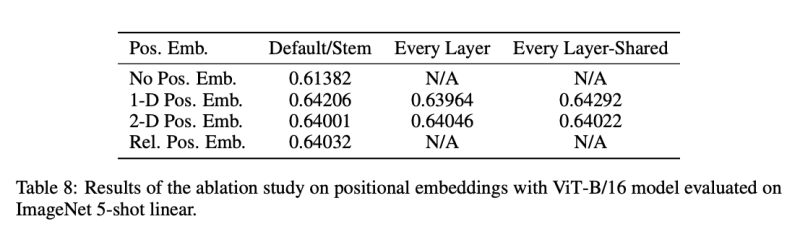 One of the interesting findings is 2D positional embeddings did not bring significant performance gains when compared with 1D positional embeddings.
