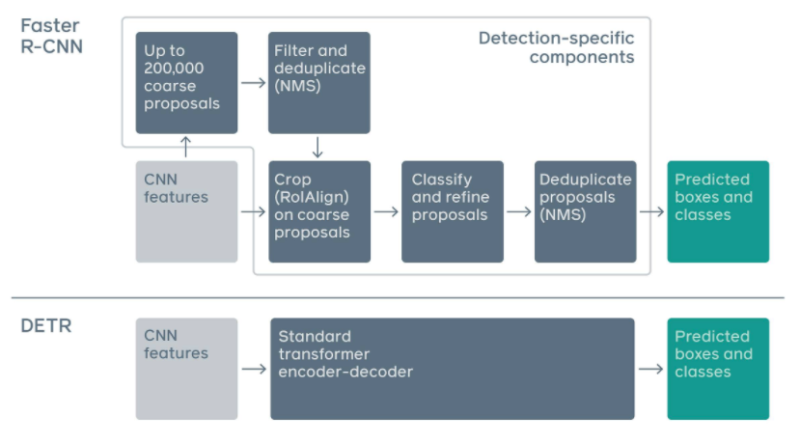 With the traditional object detection methods, like Faster R-CNN, there are multiple steps to do anchor generation and removing duplicates with non-maximum suppression (NMS) procedures. DETR dropped these hand-designed components to significantly streamline the object detection pipeline.