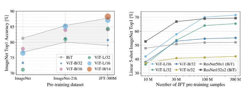 - The hybrid architecture (CNNs + Transformer) performs better than pure transformer in smaller model size, and gets very close when the model is bigger.