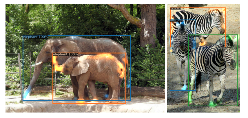 By looking at the colors/attention, you will be amazed by the model’s capability of resolving those overlapping bounding boxes with global understanding of the image through self attention. Especially with the example of the orange color zebra legs, how they have been interpreted/classified even though they are heavily overlapped with the blue and green ones locally.