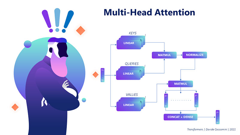 But this mechanism would be sufficient if we wanted to focus on a single word, but what if we wanted to look at the sentence from several points of view and then calculate several times, in parallel, the attention? We use so-called multi-head attention, with a similar structure whose results are simply combined at the end to return a single, summarizing vector of all the calculated attention.