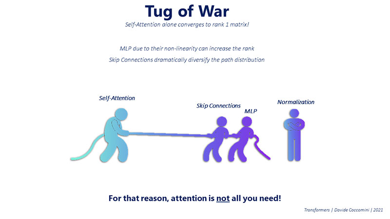 The first allows to diversify the distribution of paths avoiding obtaining all the same path and this drastically reduces the probability that the matrix is reduced to rank 1. The MLP instead manages to increase the rank of the resulting matrix due to its non-linearity. In contrast, it has been shown that normalization plays no role in avoiding this behaviour of the self-attention mechanism. Therefore, attention is not all you need, but the transformer architecture manages to use it to its advantage to achieve impressive results.