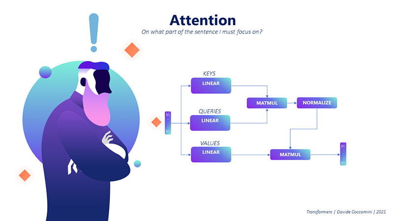 To build this mechanism we use linear layers that, starting from the input vector, generate keys, queries and values, by matrix multiplication. The combination of keys and queries will allow obtaining the most correct matching between these two sets, whose result will then be combined with the values in order to obtain the most relevant combination.