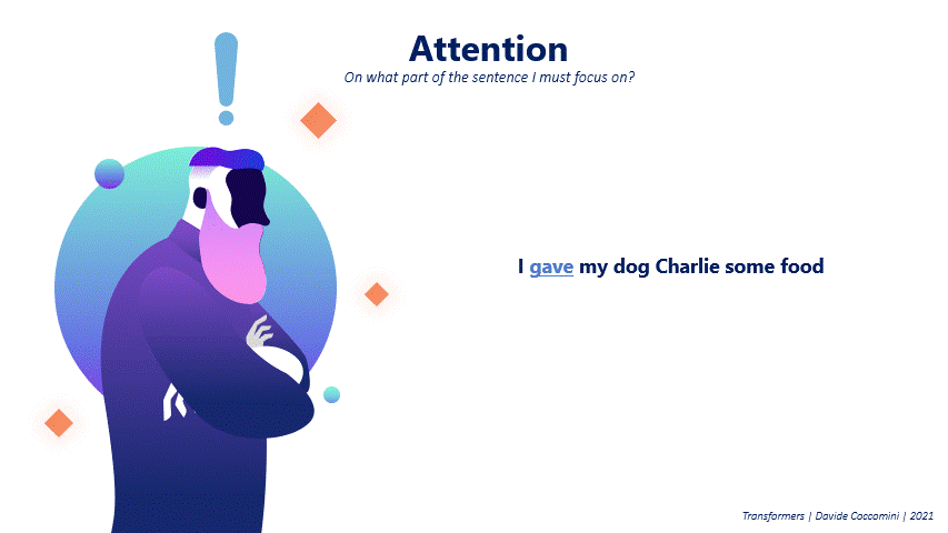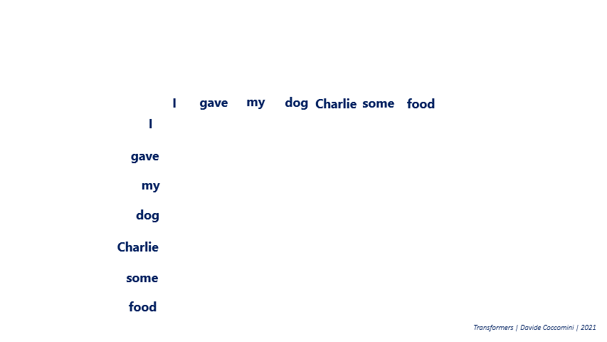 Let’s take an example sentence and ask ourselves, focusing on the word “gave,” what other words in the sentence should I place my attention on to add meaning to this word? I might ask myself a series of questions, for example, who gave? And in this case, I would focus on the word “I,” and then I might ask To Whom gave? Placing my attention in this case on the word Charlie and finally, I might ask, what gave? Focusing finally on the word food.