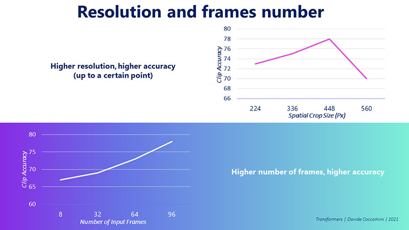 The authors also questioned the relevance of the resolution of the videos and the number of frames in them and found that the higher the resolution the better the accuracy of the model, up to a point. As for the number of frames, again as the number of frames increases, the accuracy also increases. The interesting thing is that it was not possible to make tests with a higher number of frames than that shown in the graph and therefore potentially the accuracy could still improve, we have not yet found the upper limit of this improvement.