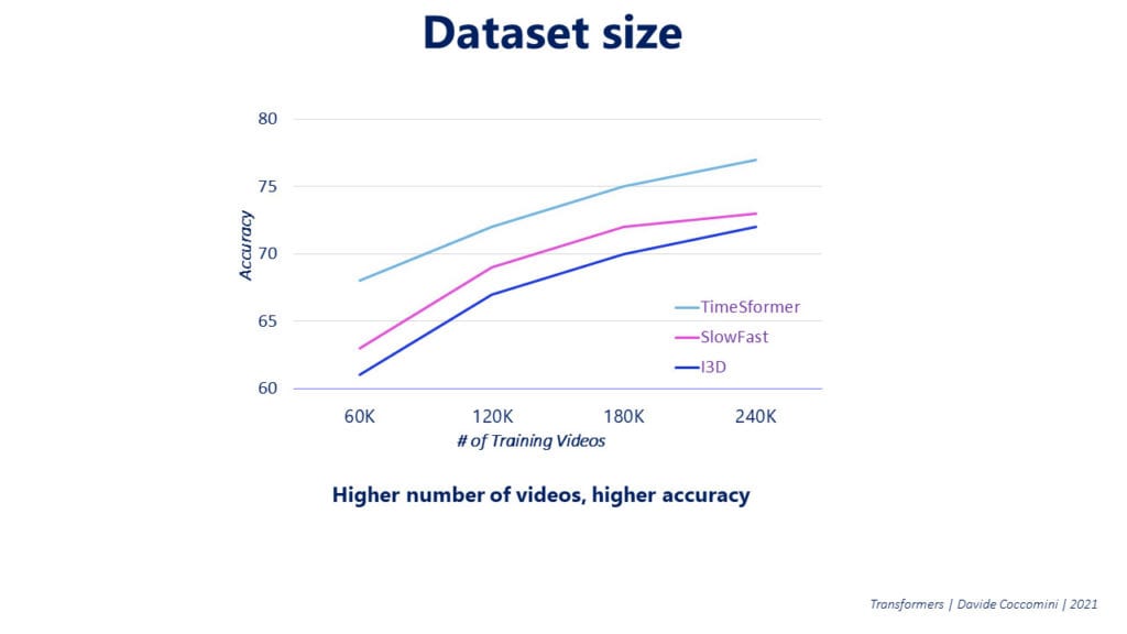 In Vision Transformers it is known that a larger training dataset often results in better accuracy. This was also checked by the authors on TimeSformers and again, as the number of training videos considered increases, the accuracy also increases.