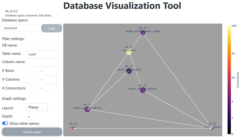 The picture above shows the web application after running a search for all tables with the string “auth” in their name and setting the depth to 1 (tables connected to the search result tables are included). Note that I changed some names here for data protection reasons.