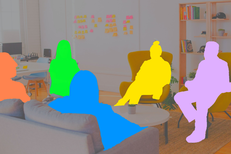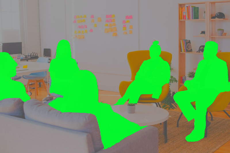 For neural networks, however, this is easier. Instead of having a variable-sized output, we have to classify each pixel, thus making a mask. Therefore, we need one output pixel for each input pixel. Here is an example of one of the above scenes processed by a people segmentation tool: