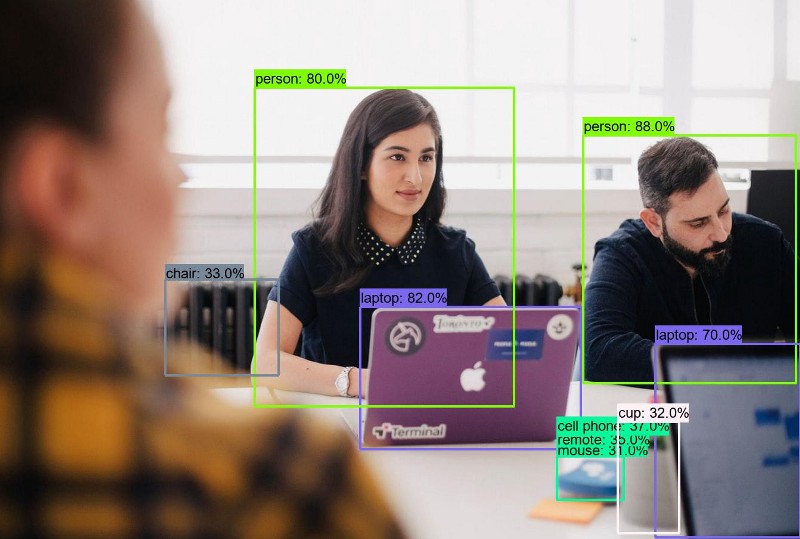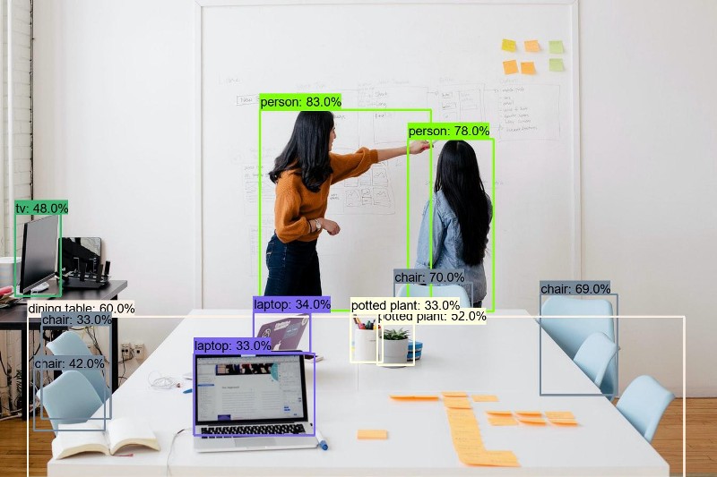 This is a mess! Yet, you can see there is a percentage along with each box. This percentage shows the “confidence” the algorithm has on the classification. If we threshold this to some value, such as 50%, we get the following: